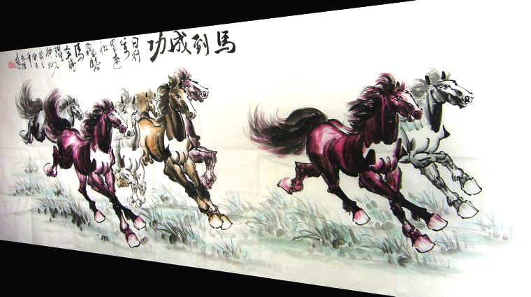 作品简评在池永浩先生的奔马图中,令人神思飞越,生发出朝气勃勃、奋发向上的力量。这幅《马到成功》绘八匹颜色各异的骏马在广袤的草地上奋踪扬蹄,迈着快捷的步伐,飞舞的鬃毛和马尾随之飞扬,给整幅作品带来了清新、有力、刚劲的气息。整幅作品气势磅礴,意境开阔,笔墨浑厚,气韵生动,用笔老辣酣畅,泼墨苍劲。奔马图最适合办公室悬挂兼具极高的收藏价值。