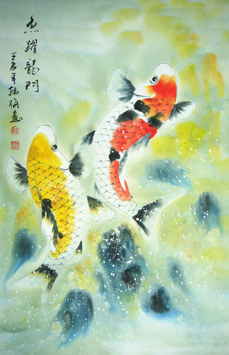 • 产品简介: 吉祥画鱼跃龙门,齐鲁画家韩梅作品,已装裱。
