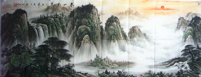 第一字画网的客厅国画山水画装裱以后在2.2米左右,是一幅大气磅礴的小六尺山水,作品意境生动、山水交汇,清新秀雅,布局合理,视觉效果上佳,看作品的气势、云层和山脉的细节,就能看出老师的深厚画功,画面上的红日寓意着鸿运高照,如果放在画廊出售,刘淋老师此幅山水画的标价在5000元左右,作品的气势和画功都是一流的,适合挂在客厅、或公司的会议室等场合
